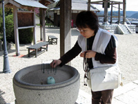 手水場で手を洗い、口をすすいで心身を清めます。水は、飲まないようにします。